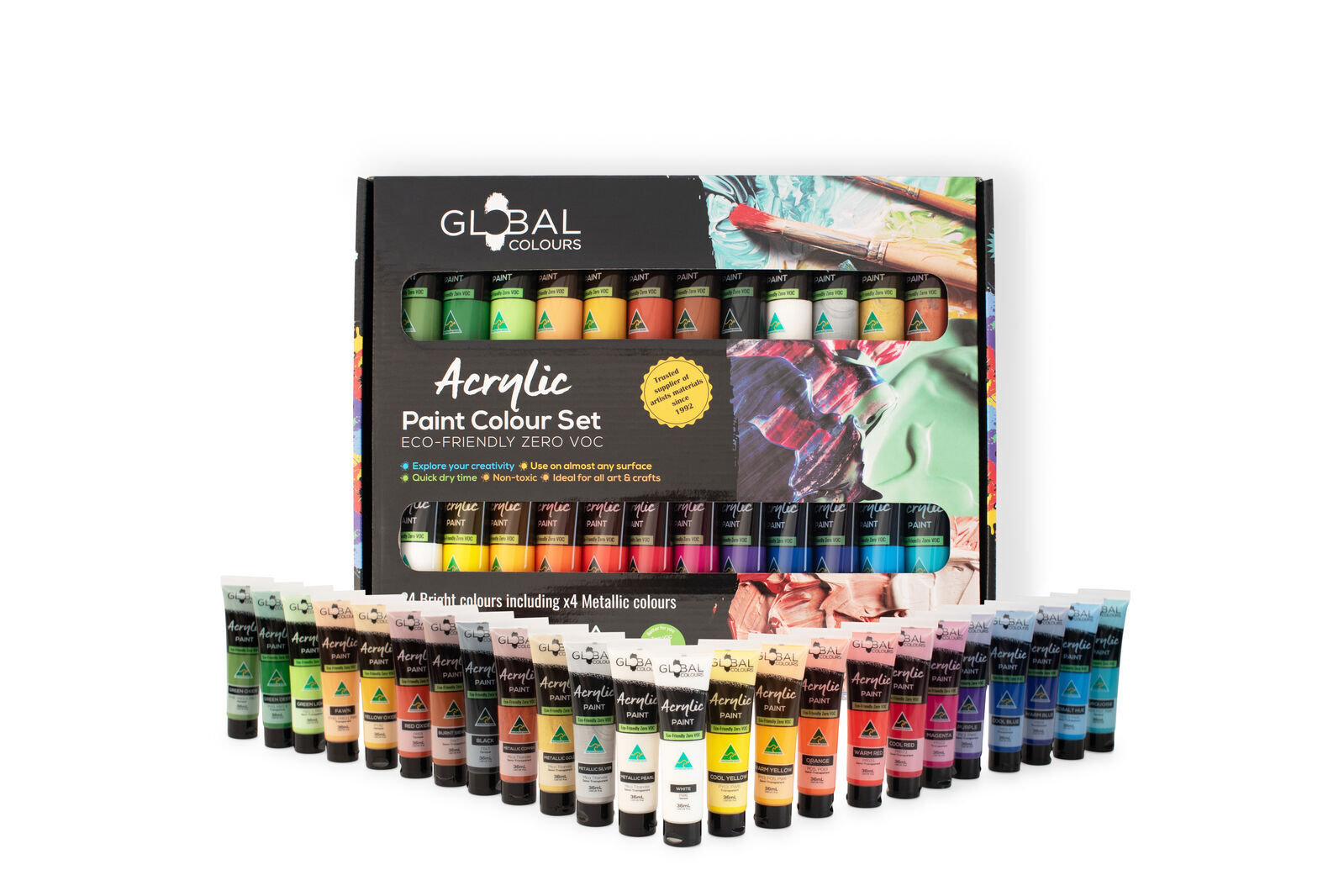 Global Colours' Eco-Friendly Acrylic Paint Sets are a high-quality acrylic and can be applied undiluted by either brush or palette knife, used with pouring medium for pouring creations or thinned with water for washes to create an effective watercolour look. With Global Colours' Eco-Friendly Acrylics paint, you are only limited by your imagination. Explore any art, craft or design activity. Incredibly versatile and economic, Global Colours' Eco-Friendly Acrylics paint are economically priced without sacrificing quality or integrity. Use with stencils, textiles, potato, bark, modelling, transfers, cork imprints, woodcuts and marbling and simulated oil painting. Global Colours use only the highest quality pigments and ingredients.